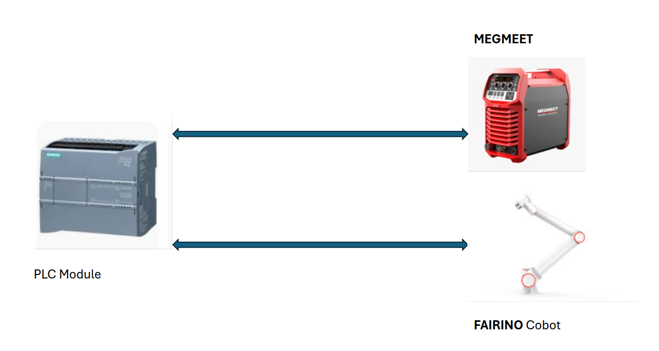 System Logic: The PLC simultaneously manages the FAIRINO cobot arm and the MEGMEET.