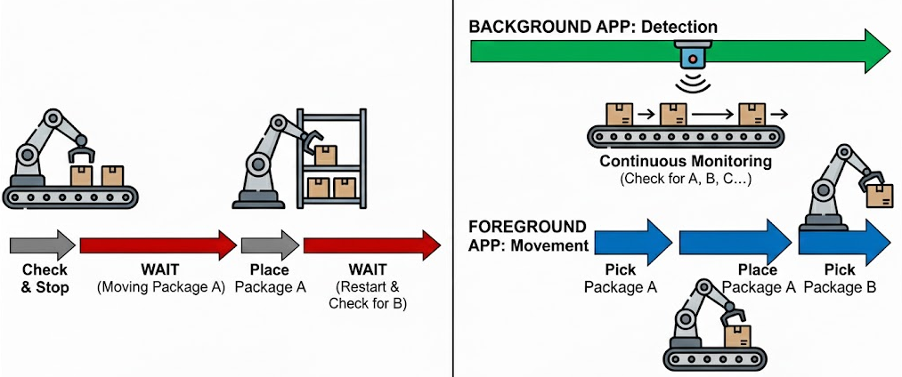 This limitation can be resolved by separating the package-detection logic from the package-removal logic. By running the detection logic in a Background Application, the cobot can continuously monitor for new packages while the foreground application handles movement, gripping, and other tasks.