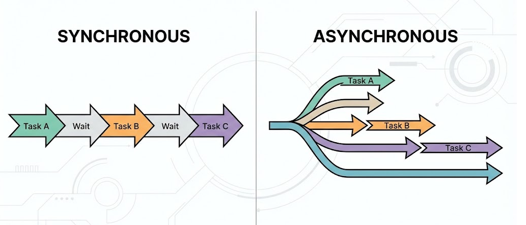 An asynchronous application enables the cobot to execute two or more independent logic threads concurrently. This is particularly useful when certain events or conditions must be monitored continuously, even while the main program is executing. With a single-thread setup, the robot must finish the entire foreground program before evaluating conditions again, making real-time reactions difficult or impossible.